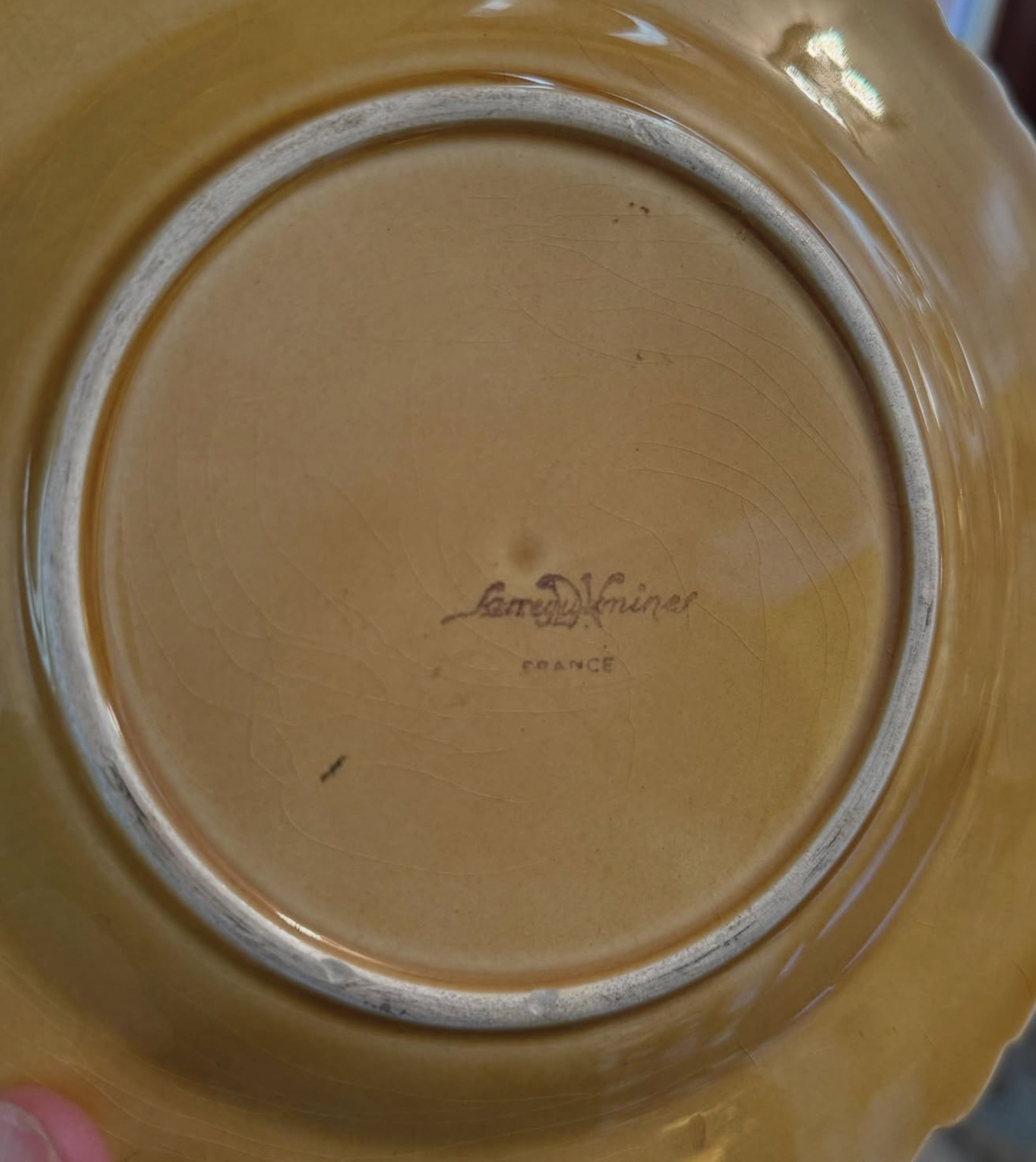 Marked Luneville Keller & Guérin, France on reverse. Gorgeous yellow glaze with deep pink cherries and soft green leaves — classic French countryside charm!