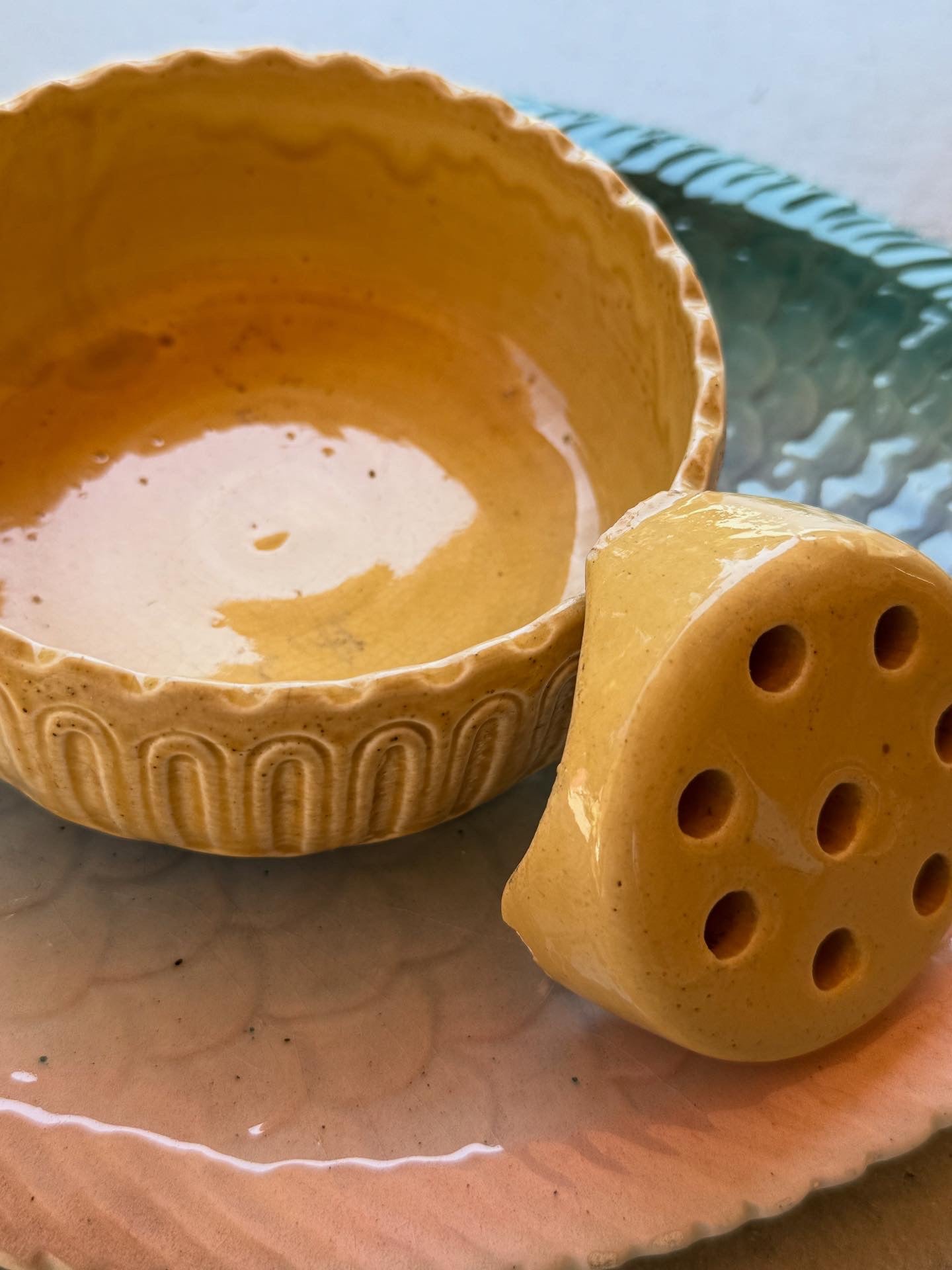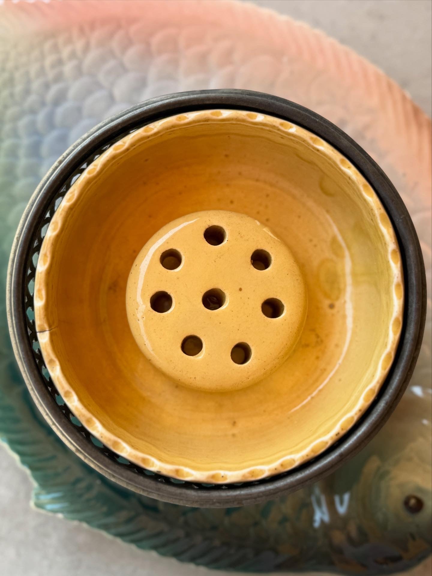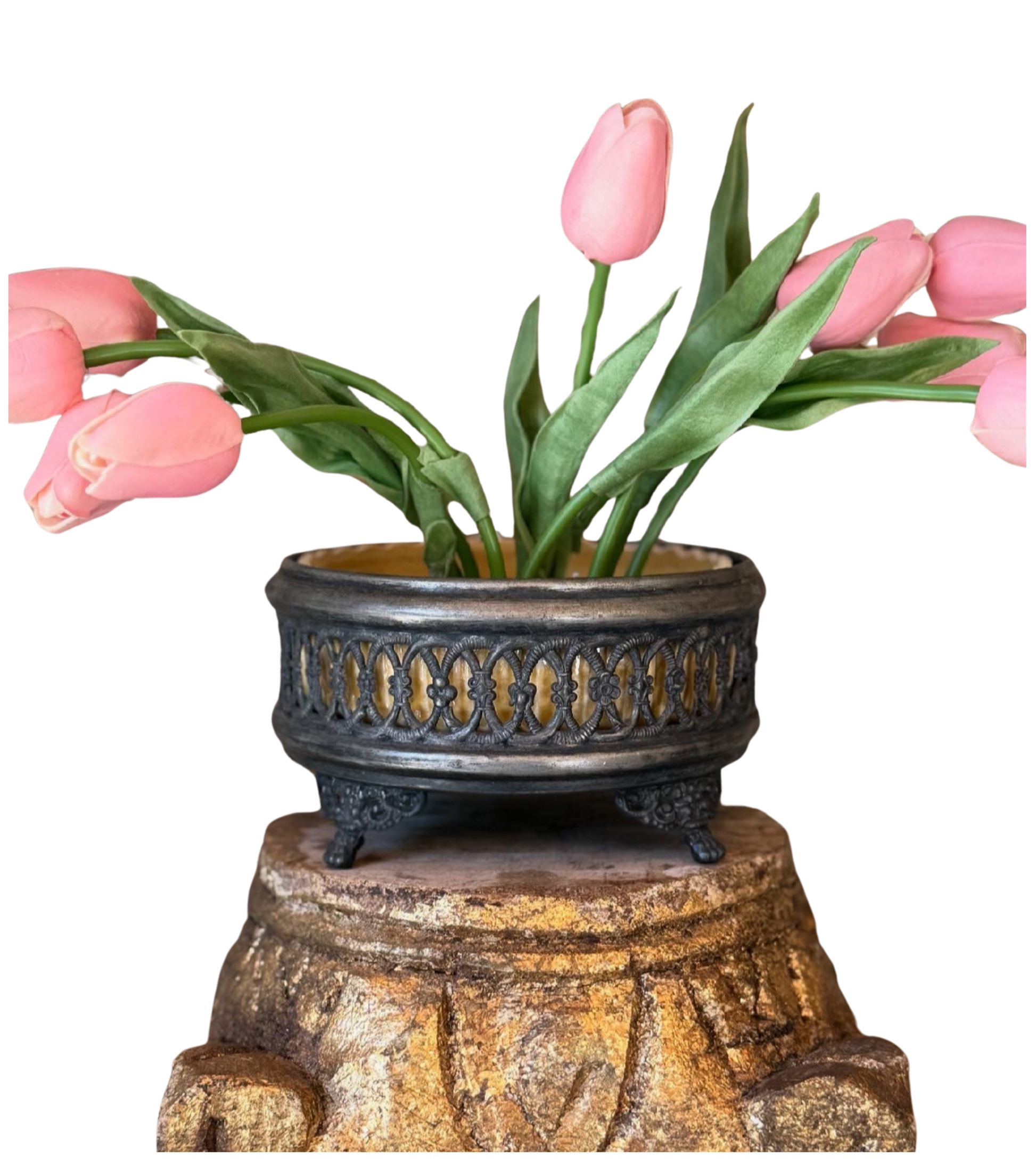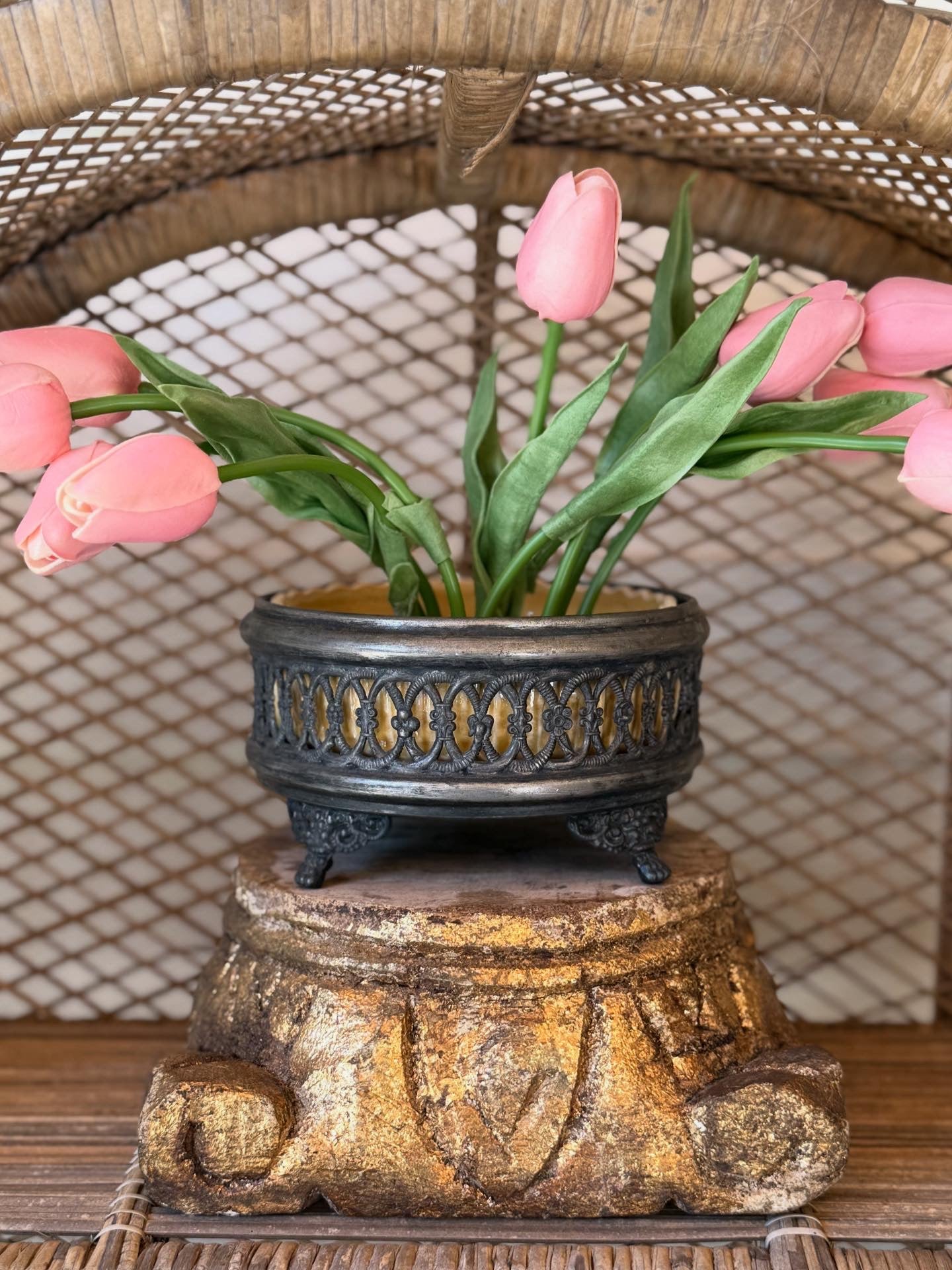 A complete and rare find — this Weller Pottery console set includes the yellow glazed ceramic liner and the original Weller-marked flower frog, all housed in its ornate cast metal holder with rich, aged patina.