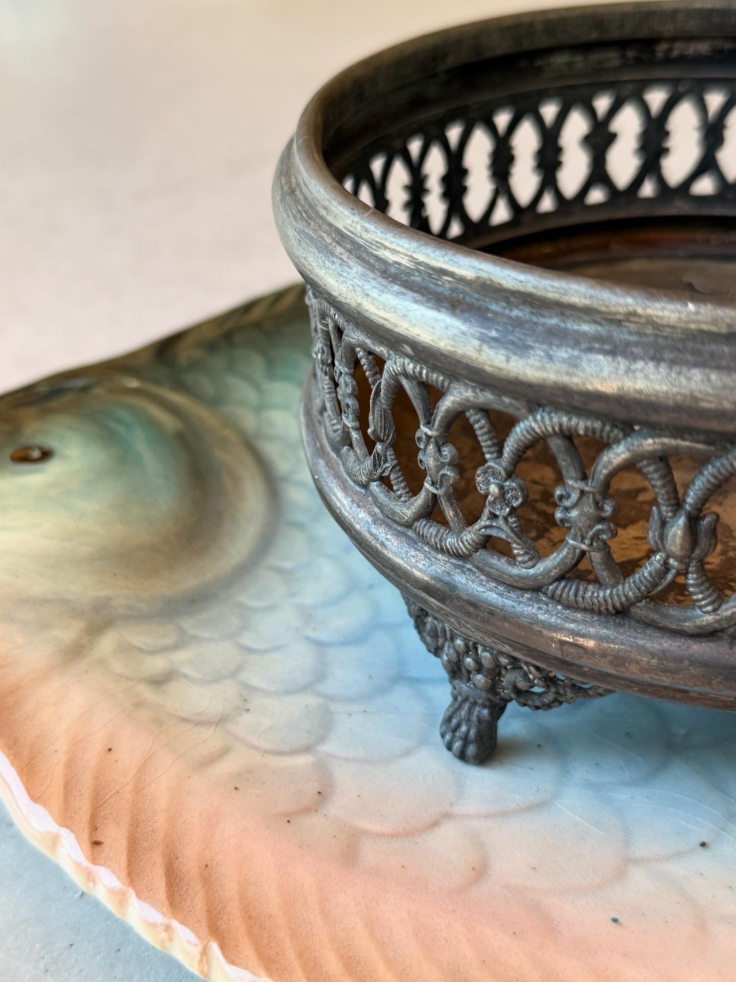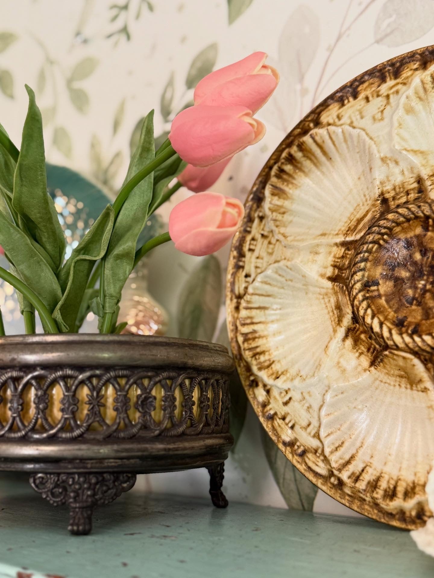 Perfect for fresh or faux florals, this piece brings a true Arts & Crafts / early 20th-century charm to any table or mantel. Hard-to-find complete and in such lovely condition, even with the liner’s character crack — it displays beautifully.